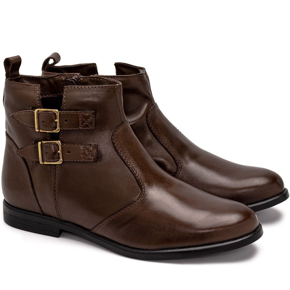 Bota Casual em Couro First Concept Cano Curto com Ziper e Detalhe Fivelas