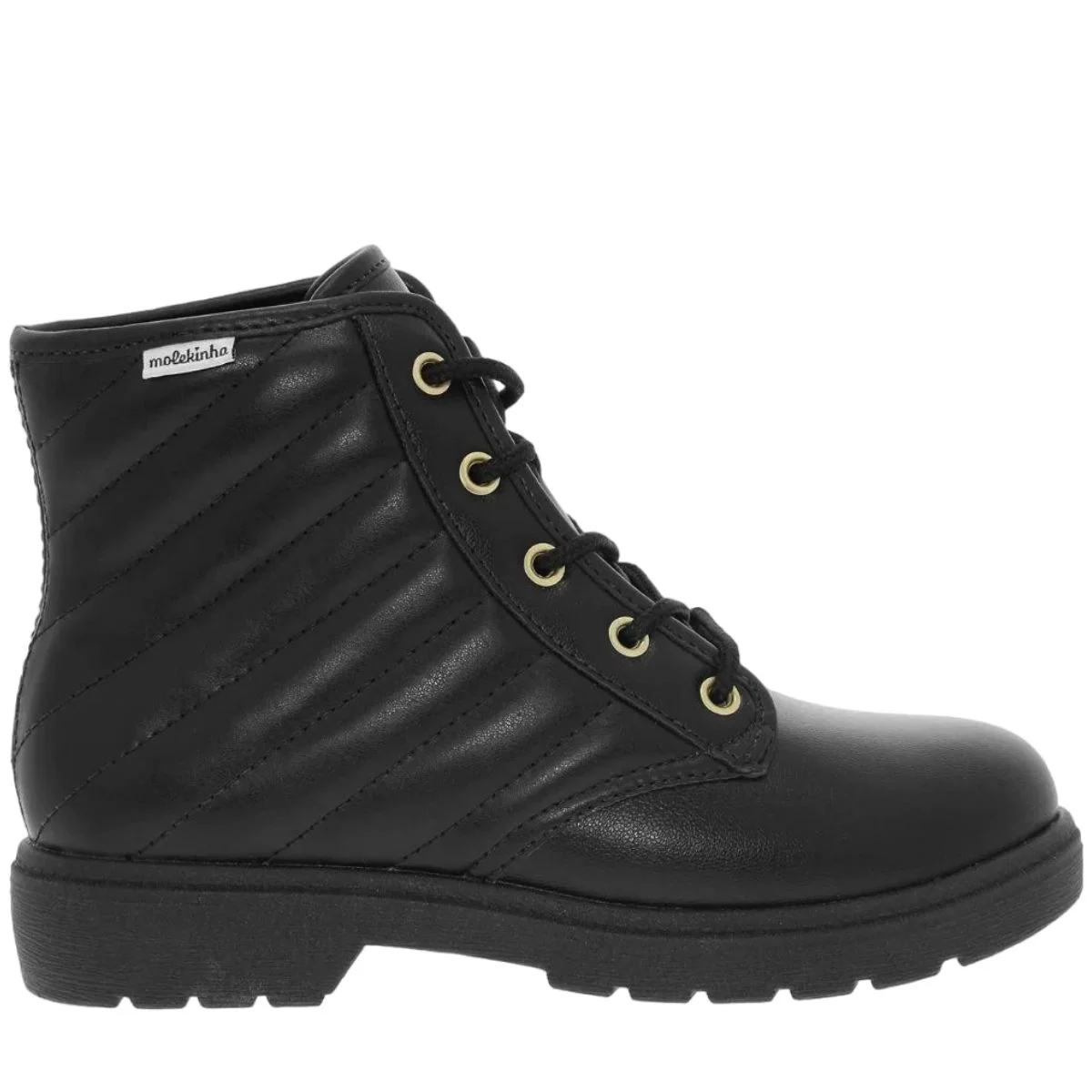 Apresentamos o Coturno Infantil Menina Molekinha, um calçado confeccionado com material sintético de alta qualidade, que combina estilo e durabilidade. Seu solado rasteiro é feito em borracha antiderrapante, proporcionando firmeza e segurança ao caminhar, além de conferir um toque robusto e versátil ao modelo.