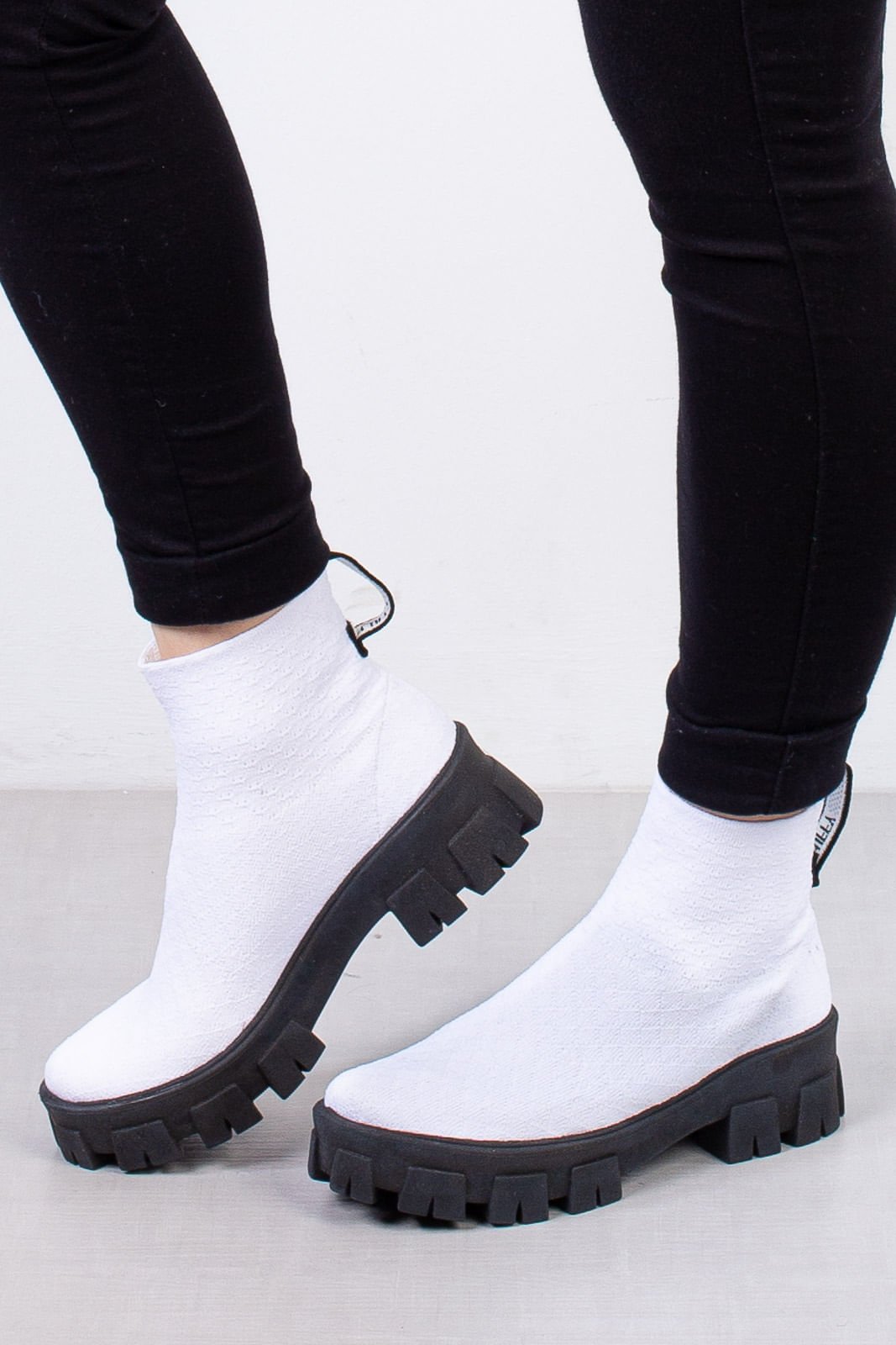 Bota de malha feminina tratorada, ela possui solado tratorado e a parte de cima em malha, o que proporciona muito conforto. A botinha tem o acabamento traseiro em preto, que combina com o seu solado. Ela une beleza, estilo e conforto, ideal para compor muitos looks de inverno.