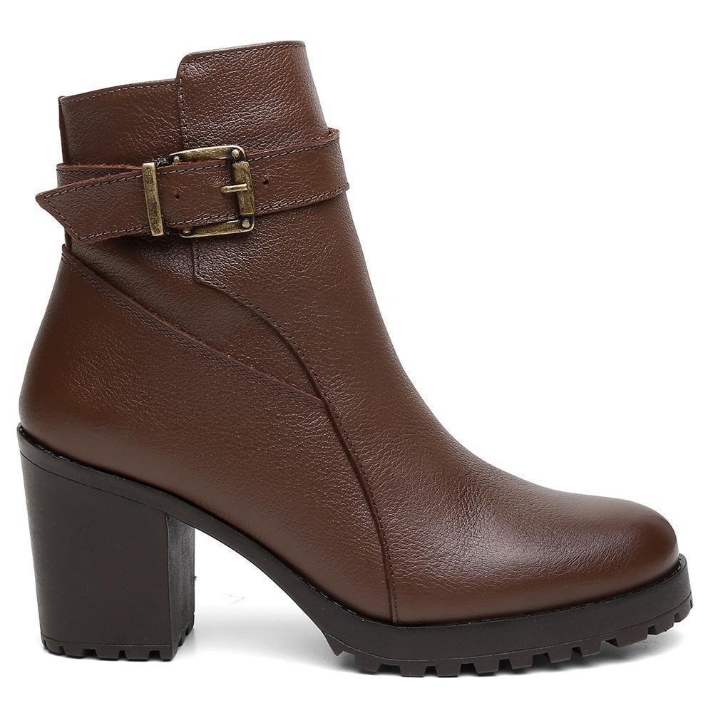 Bota Feminina Couro Casual Cano Médio Fivela Salto Tratorado Marrom