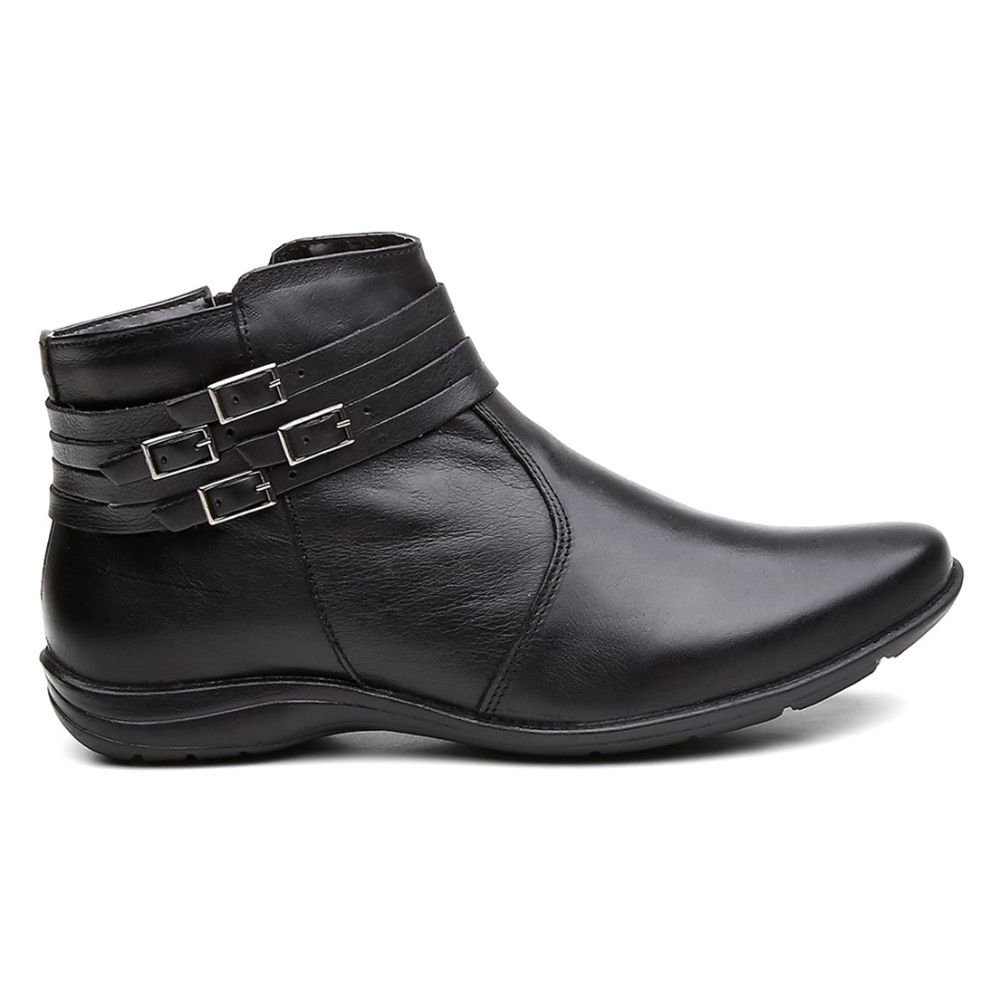 Bota Flat em Couro Feminino Rasteira Zíper Fivelas Resistente Confortável Preto