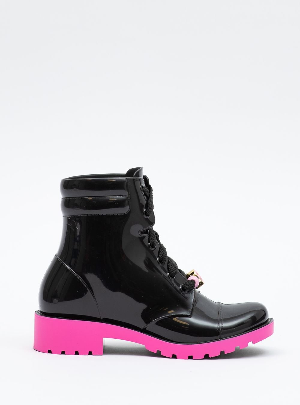 Bota infantil, estilo coturno, produzida em J-Lastic e com fechamento por atacadores. O modelo conta com sola colorida levemente tratorada e cabedal translúcido.