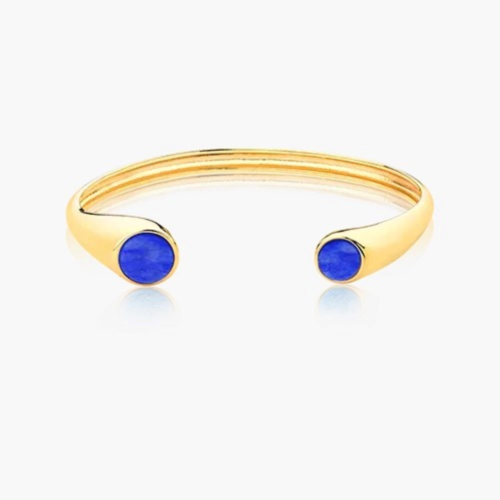 Pulseira ANIA STORE estilo bracelete com detalhe redondo de pedra Feldspato Azul Royal. A Semijoia tem a base Dourada Banhada a Ouro 18k. Acessório moderno, ideal para qualquer ocasião do dia ou da noite. A pedra Feldspato dá respiração e sucesso no amor, estimula a capacidade de amar, encoraja as ligações pessoais e eleva as energias da vida emocional. Além de ampliar a autoestima.