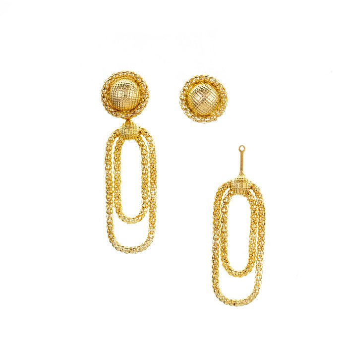 Brinco 2 em 1 Meia Esfera e Correntes 2 Voltas Folheado a Ouro 18k