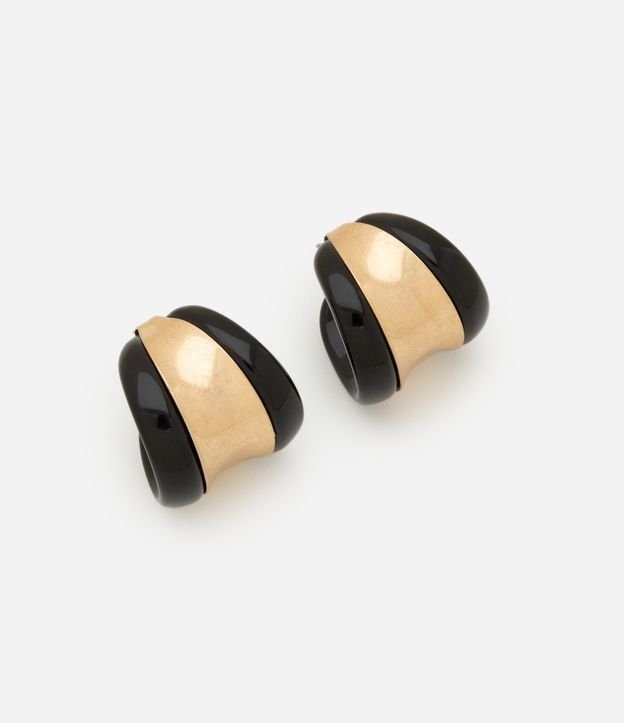 Argola em metal com formato curvado e orgânico. Possui contraste de acabamento brilhante e detalhes em metal. O fechamento é por pino e tarraxa.
