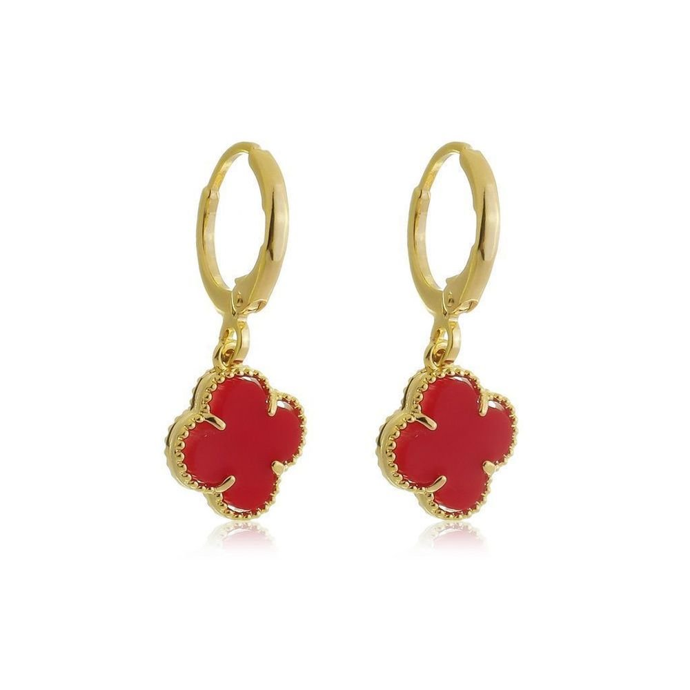 Brinco Argola Pingente Mini Trevo Vermelho Semijoia Banho Ouro