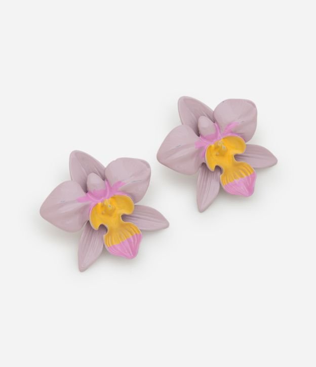 Brinco botão feminino confeccionado em metal com formato de flor orquídea. Possui detalhes de miolo amarelo na flor.