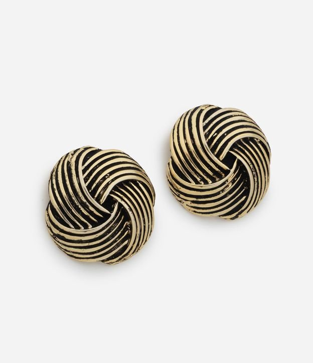 Par de brincos feminino confeccionados em metal com design botão entrelaçado em relevo, formado por tiras curvas texturizadas.