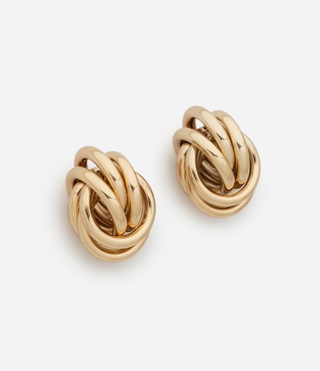 Brinco feminino em metal com modelo botão e formato de nó entrelaçado, composto por hastes arredondadas. Possui acabamento polido e tamanho médio, ideal para uso diário e composições casuais.