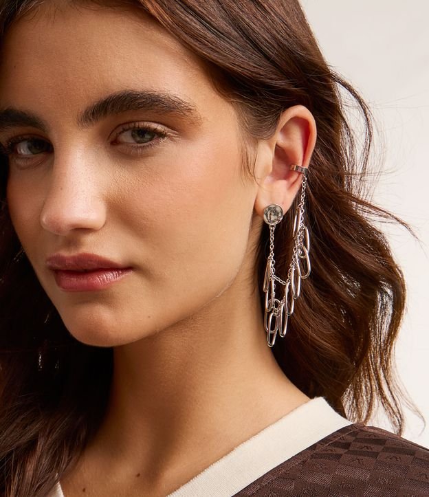 Brinco Ear Cuff Assimétrico com Correntes e Brinco Botão
