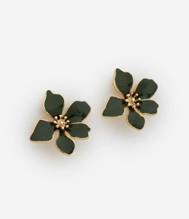 Par de brincos femininos confeccionados em metal. Possui formato de flor e acabamento resinado.