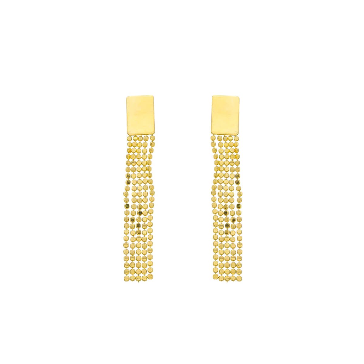 Inovador e estiloso, o Brinco Folheado a Ouro 18k Franja com Placa Retangular e Corrente de Bolinhas Espelhadas é o acessório perfeito para destacar o seu look!