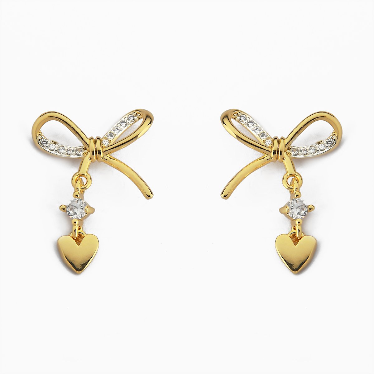 Brinco Laço com detalhes em Zircônia com Ponto de Luz e coração Banhado em Ouro 18k Dourado