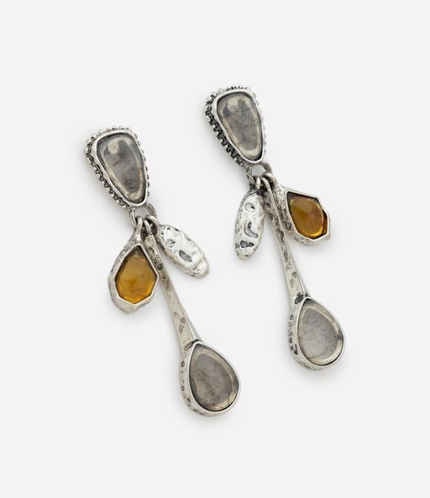 Brinco feminino médio em metal reciclado mais sustentável. Possui formas orgânicas, base alongada, duas gotas em resina, criando movimento.