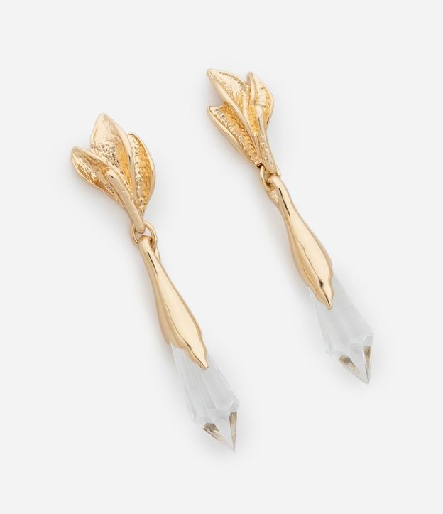 Brinco médio com fechamento por tarraxa e banho Light Gold. Sua base tem detalhes em folha e seu pingente é em cristal.