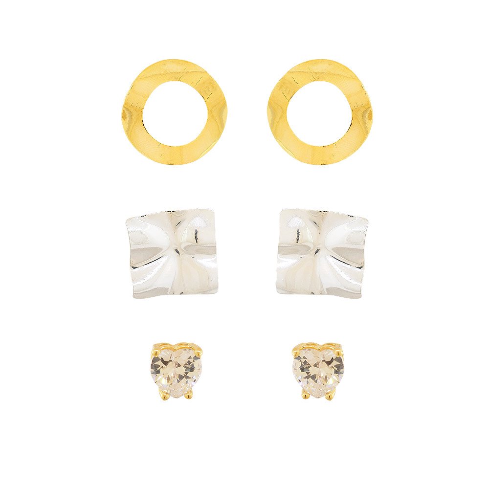 E uma semijoia com banho de ouro 18k e banho de rodio, usar um mix de trio de brincos pode ser uma maneira divertida e estilosa de adicionar personalidade ao seu visual.Se estiver usando um mix de trio de brincos chamativo, pode ser uma boa ideia manter outros acessorios mais simples para nao sobrecarregar o visual.Peso brinco maior: 1,0 gr CadaPeso brinco medio: 0,9 gr CadaPeso brinco menor: 1,6 gr CadaDiametro brinco maior: 2,0 cm CadaDiametro brinco medio: 1,5 cm CadaComprimento brinco menor: 1,0 cmLargura brinco menor: 0,8 mmMaterial: Banho de ouro 18k e banho de rodio