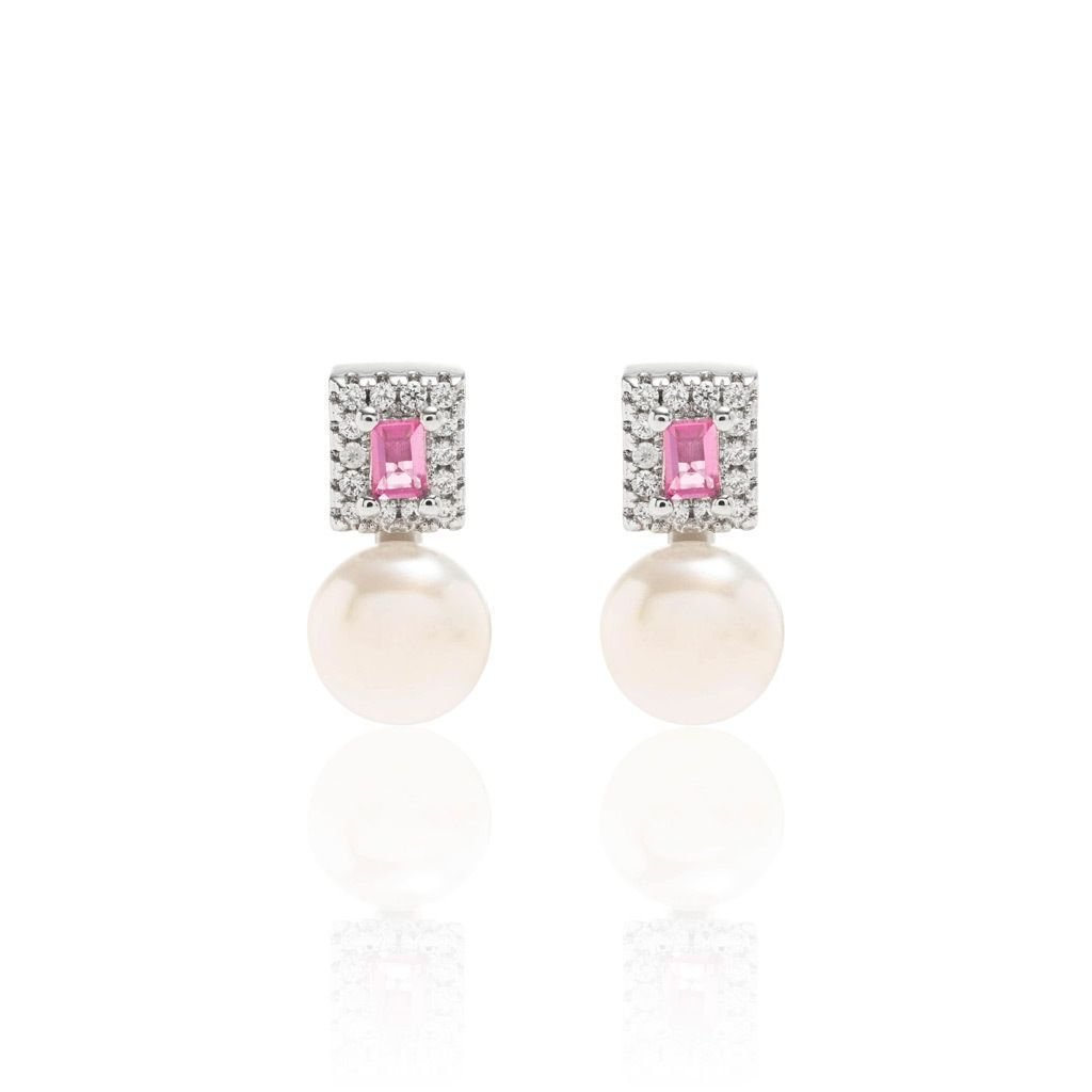 Brinco Zircônia Rosa com Pérola Semijoia Banho Rodio