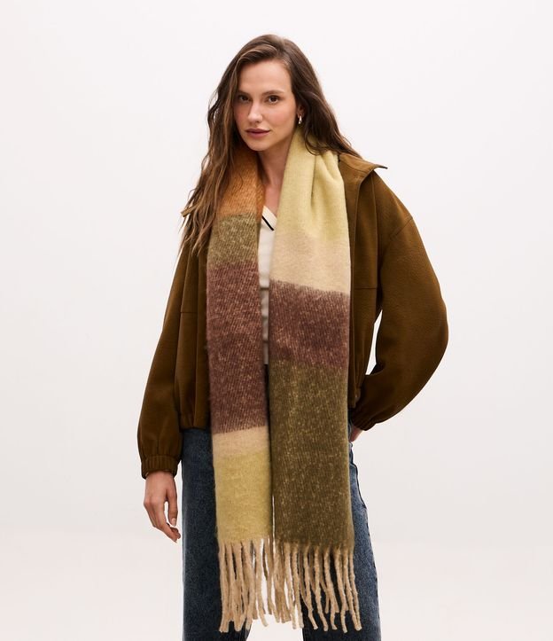 Cachecol feminino confeccionado em flanela, possui bloco de cor e franjas.