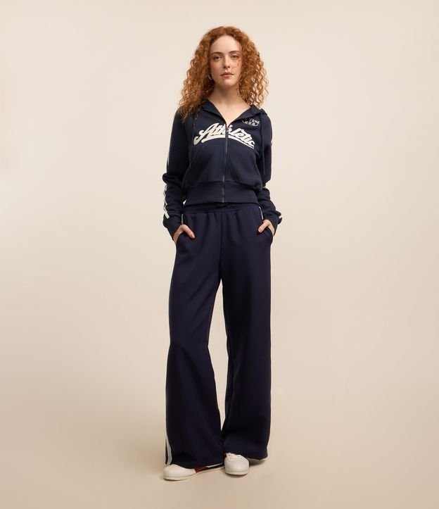 Calça reta com corte alfaiatado, confeccionada em poliéster, com cós elástico e cordão para ajuste, Possui frisos contrastantes na lateral.