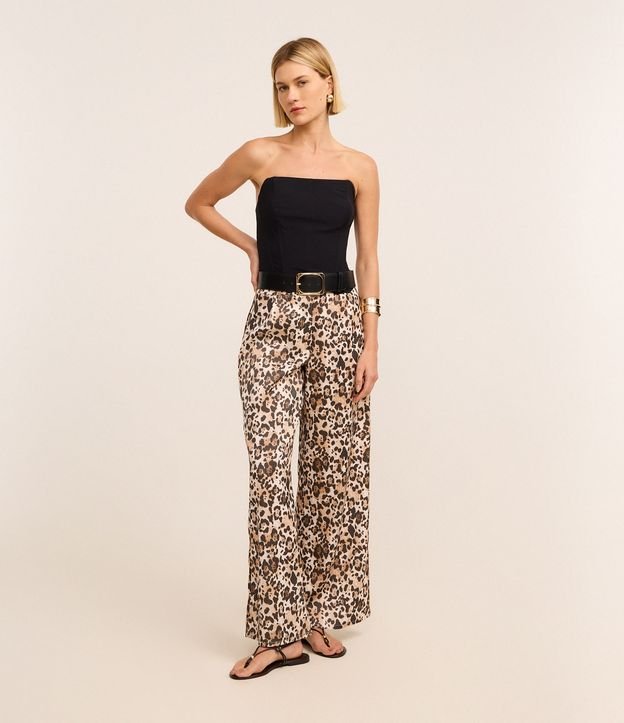 Calça feminina acetinada no modelo wide leg com cós fixo, fechamento por vista oculta, pregas e estampa animal print oncinha.