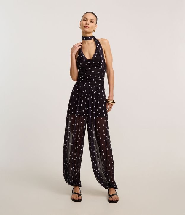 Calça feminina confeccionada em tule, com cós elástico e transparência nas pernas. De modelo aladim a peça é soltinha, ajustada nos punhos, possui estampa poá e conta ainda com forro na altura de short.