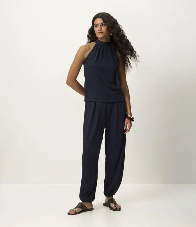 Calça comprida feminina texturizada. Possui modelagem aladim, com volume amplo nas pernas e afunilamento na barra. Cós com elástico embutido e pregas frontais que acrescentam amplitude.