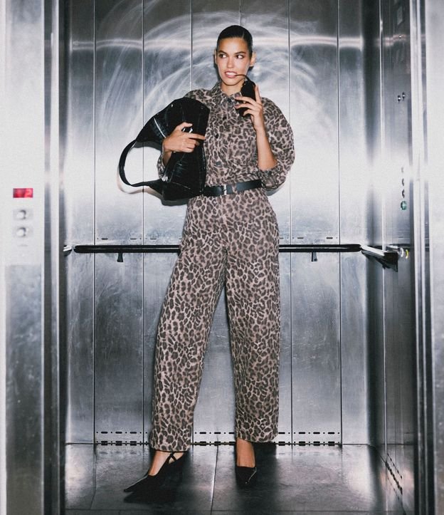 Calça baggy confeccionada em sarja encorpada, com cintura média e estampa animal print que destaca o visual moderno. Possui pernas amplas, bolsos funcionais e fechamento frontal tradicional, garantindo estilo e estrutura ao look. Confeccionada em algodão certificado BCI.