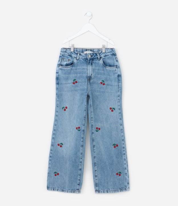 Calça Balloon Infantil em Jeans com Bordado de Cerejas - Tam 5 a 14 Anos Azul