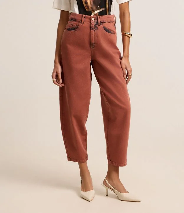 Calça Barrel Cropped em Jeans com Mix de Tingimentos Marrom