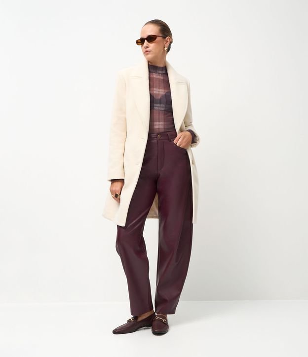 Calça barrel feminina confeccionada em PU. Possui cintura alta e pernas amplas que afunilam levemente nas barras, cós com passantes, bolsos funcionais e fechamento frontal por botão e zíper.