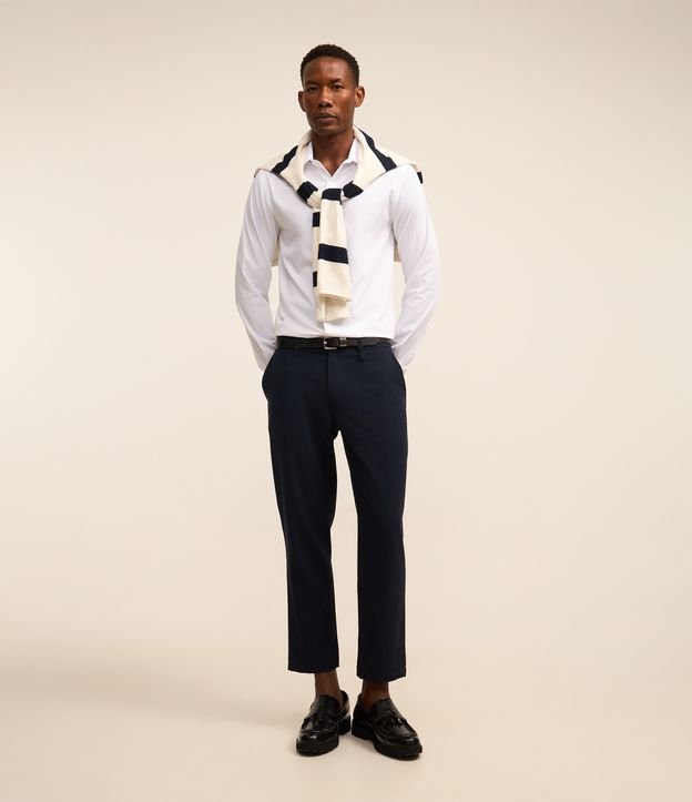 Calça masculina confeccionada em tricoline mais sustentável no modelo slim cropped básica, modelagem alafaiatada, com cós com passante e bolsos frontais e traseiros.