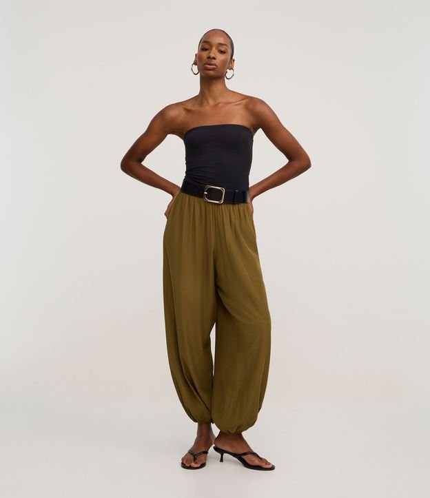Calça Boho Balloon em Viscose com Elástico no Cós e Barra Verde Oliva