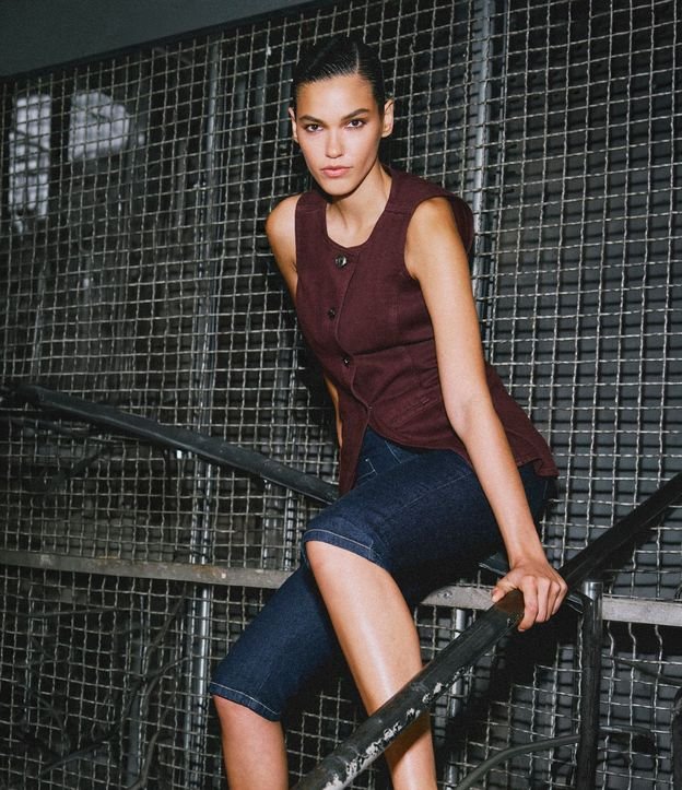 Calça modelo capri confeccionada em jeans de algodão certificado BCI com elastano, oferecendo estrutura e conforto. Possui cintura média, bolsos frontais amplos, cós com passantes e fechamento frontal, criando visual moderno para composições casuais e versáteis.