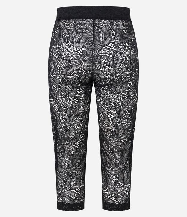 Calça feminina de modelo capri, confeccionada em renda de textura floral e sem forro.