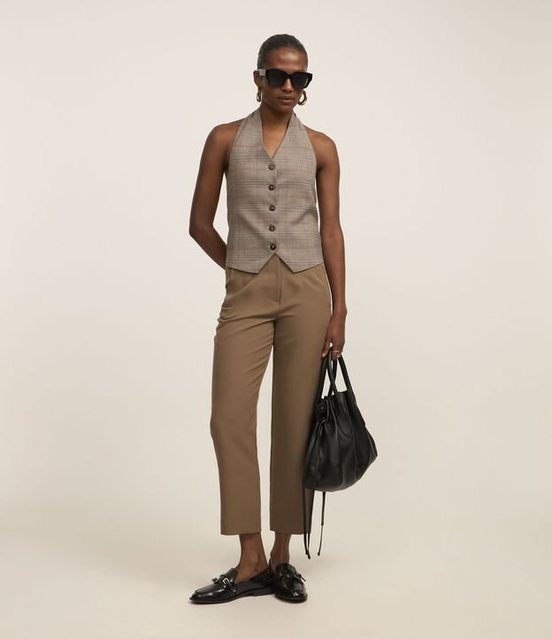 Calça Cenoura Alfaiatada com Botão Decorado no Cós Bege Escuro