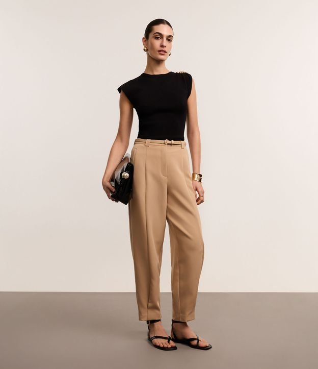 Calça cenoura de corte alfaitado e cintura alta, com passantes no cós, além de pregas frontais e pences atrás. Inclui cinto bem fininho de PU com fivela forrada.