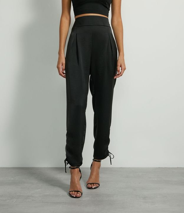 Calça Cenoura em Cetim com Cós Largo e Puxadinho na Barra