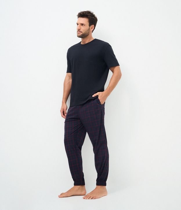 Calça de pijama masculina adulto confeccionada em plush, com padronagem xadrez, modelagem jogger, cós com elástico e amarração, além de barra com elástico, ideal para proporcionar conforto e bem-estar nos momentos de descanso.