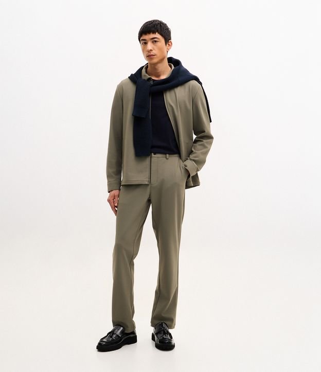 Calça confeccionada em tecido texturizado com cós passante na cintura além de bolsos.