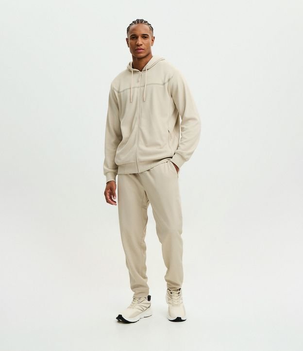 Calça Esportiva em Tecido Texturizado com Zíper nos Bolsos Bege