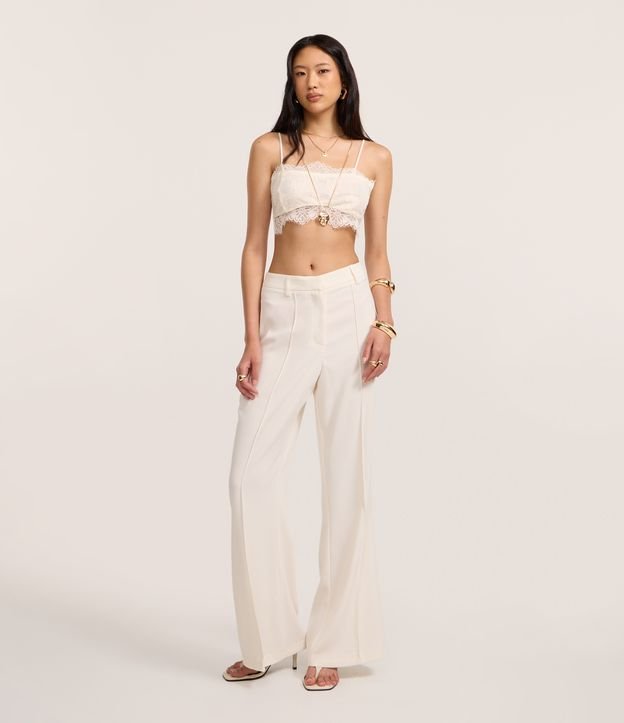 Calça flare alfaiatada, confeccionada em tecido plano, com passantes no cós, fechamento tradicional, frisos frontais e bolsos falsos atrás.