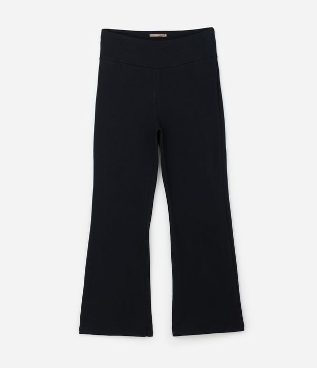 Calça feminina confeccionada em malha ribana de algodão, com cós alto e de modelo flare.