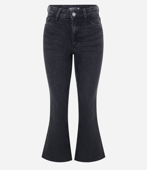 Calça flare cropped confeccionada em jeans preto estonado, com cintura média e caimento ajustado até o joelho, abrindo suavemente na barra. Possui bolsos funcionais, passantes no cós e fechamento frontal clássico. Confeccionada em algodão certificado BCI.