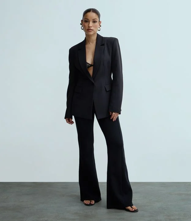 Calça flare confeccionada em ponto roma com viscose certificada mais sustentável, possui cós embutido e não possui estampa.