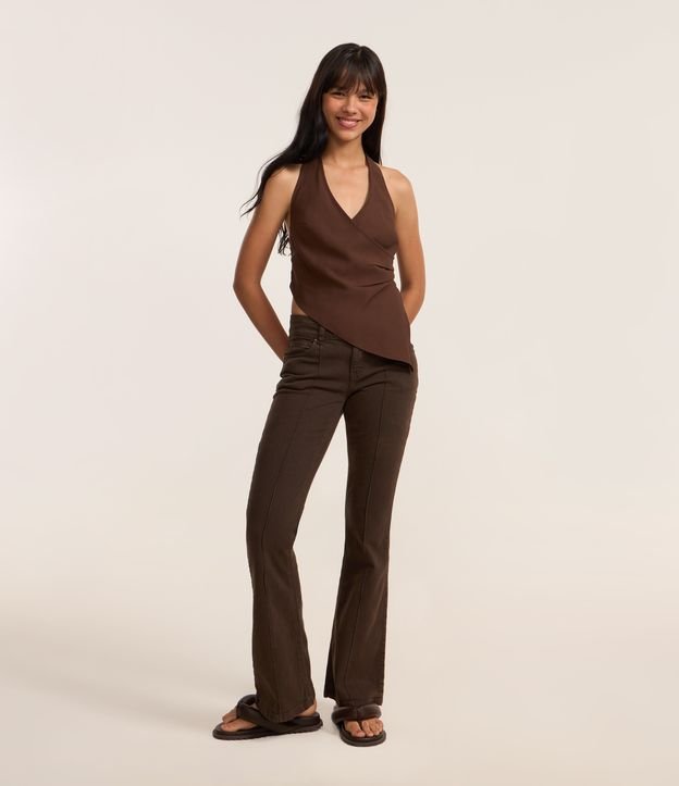 • Calça Flare em Sarja com com Cós Duplo e Frisos Marrom 3