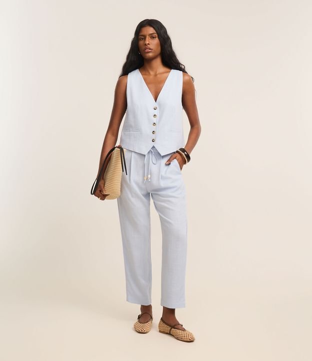 Calça Fluída em Viscolinho com Cós Elástico e Amarração Azul