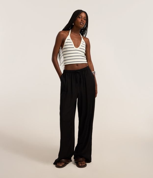 Calça Fluída em Viscose e Linho com Amarração no Cós Preto