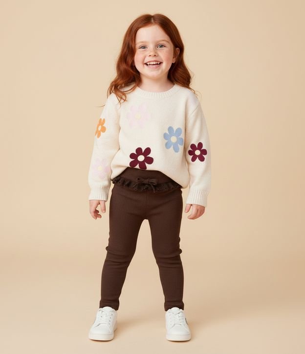 Calça infantil confeccionada em ribana canelada de toque macio e confortável. Possui modelagem ajustada ao corpo, cós elástico com aplicação de renda decorativa e acabamento delicado. Uma peça versátil para compor looks casuais com conforto e charme no dia a dia.