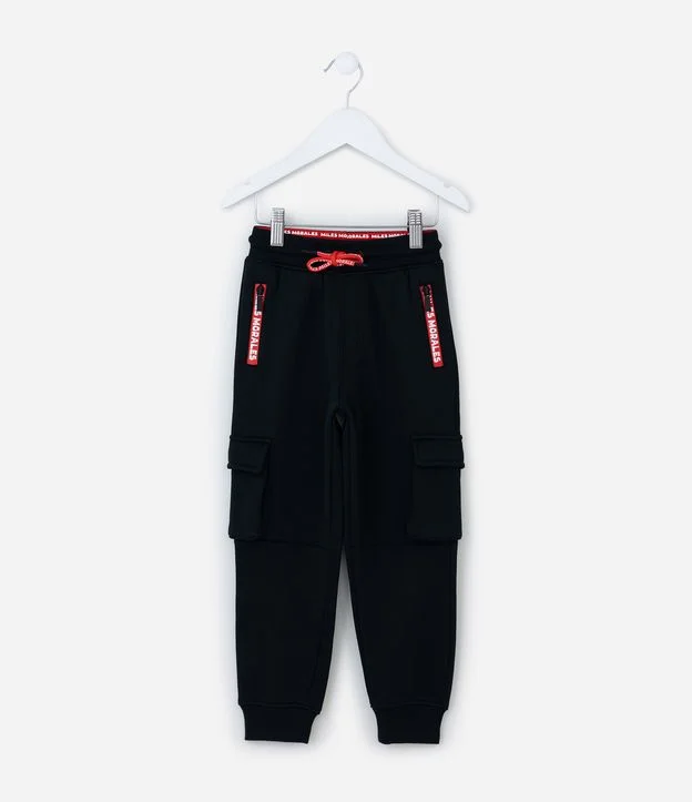 Calça infantil confeccionada em moletom mais sustentável e com boas práticas ambientais, com forro quentinho. Possui amarração no cós com cordão contrastante, bolsos frontais com zíper, bolsos cargo laterais e barra ajustada. Conta com detalhe no cós e bolsos de lettering "Miles Morales" do Homem-Aranha.