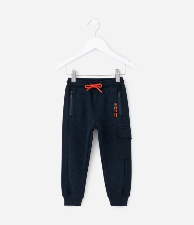 Calça infantil confeccionada em moletom com felpa, com algodão certificado BCI, garantindo toque macio e aquecimento. Possui cós elástico com cordão contrastante, bolsos frontais com zíper, bolso cargo na perna e punhos ajustados para melhor caimento.